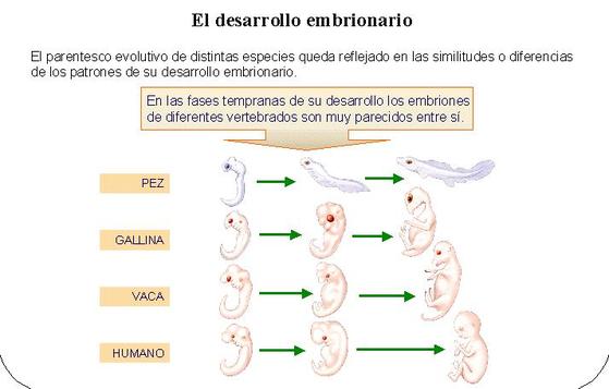 Podemos observar como en las primeras fases de muchos embriones de especies diferentes, se aprecian ciertas similitudes.